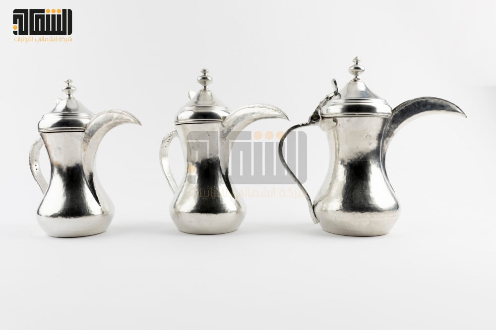 طقم دلال مهدي صالح بغدادي مصنوع من النحاس الأحمر باللون الفضي، يتكون من 3 قطع بأحجام مختلفة. مثالي لإضافة لمسة فخامة وجمال تراثي لمجلسك.